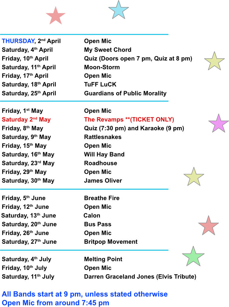 For more information – check out our Live Music and Other Events pages, for general information – or our “This Week!” page for full details of what’s coming up in the week ahead. For general information about our “Ticket Only” events, click here.