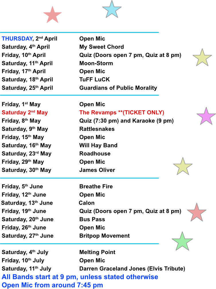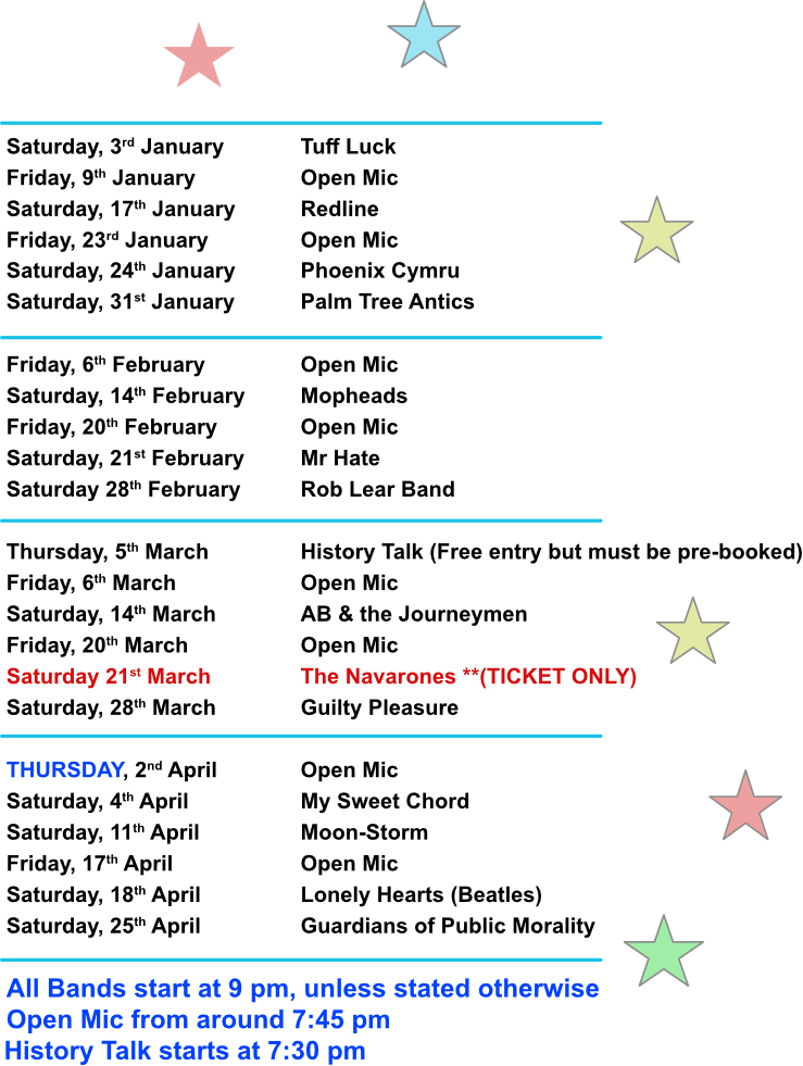 For more information – check out our Live Music and Other Events pages, for general information – or our “This Week!” page for full details of what’s coming up in the week ahead. For general information about our “Ticket Only” events, click here.